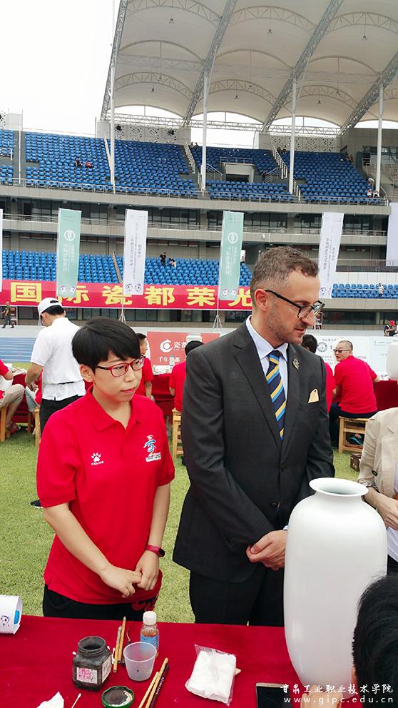 颉蓉老师与吉尼斯世界纪录中华区总经理马可先生观看陶艺家绘制的作品