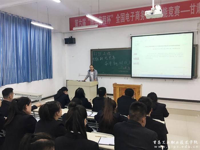 主题讲座。9月26日,在实训大楼105教室,“1231”工程学生成员邀请廖天鹏老师做题为“壮丽七十年,奋斗新时代”的讲座。廖老师用感人的历史事迹重温了新中国筚路蓝缕却又感天动地的70年奋斗史。为青年学生展示了新中国成立70周年来的伟大历史图景和辉煌成就。教育和引导广大学子要紧跟新时代的坚定脚步,不忘初心再出发,牢记使命勇担当,努力学习,积极投身社会主义现代化建设,为实现中华民族伟大复兴的中国梦贡献自己的力量。