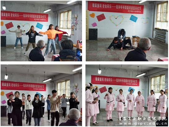 活动现场汇演内容丰富多彩,同学们为爷爷奶奶带去了精彩的舞蹈、歌曲、小品等节目。《红旗飘飘》、《歌曲串烧》、《相亲相爱》表达了对祖国大好河山的热爱之情;《爱》、《常回家看看》、《感恩的心》表达出对老人的敬爱和感恩之情;《手指健康操》、《快板之歌》传播了健康的养老理念。文艺汇演结束后,同学们还为爷爷奶奶提供了按摩、测量血压的服务。
