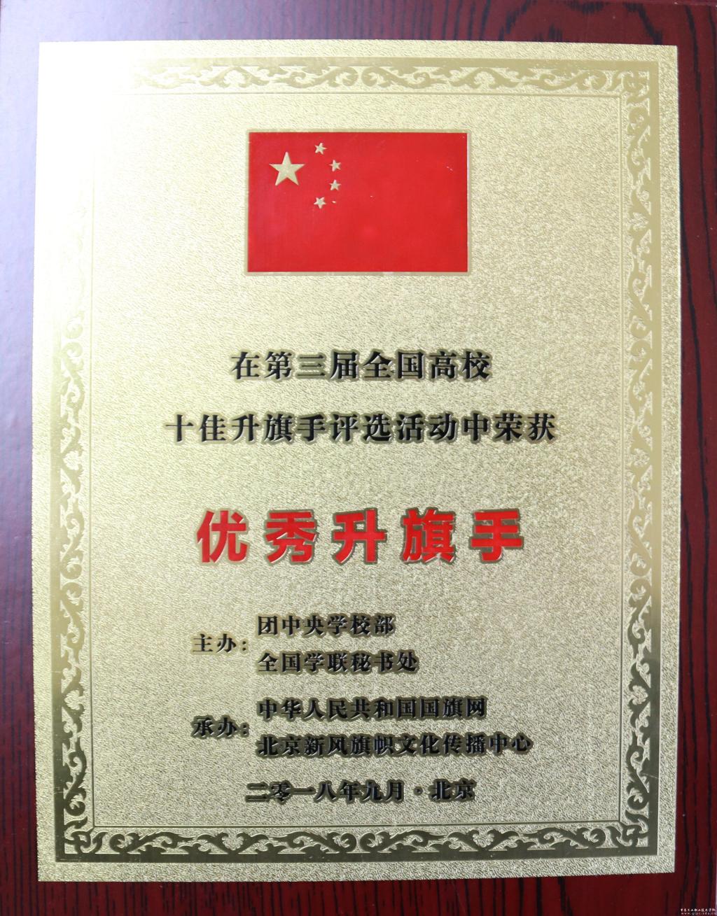 11月3日,学校国旗护卫队升旗手靳文辉同学在“青春旗帜——向祖国致敬”第四届全国高校十佳升旗手评选活动中荣获“十佳标兵升旗手提名奖”,为我校国旗护卫队再添光彩。