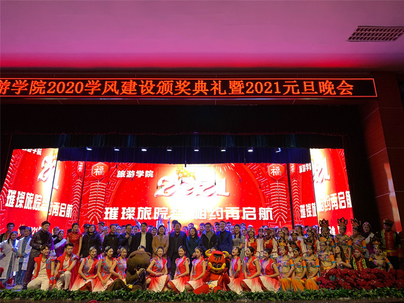 12月25日晚,旅游学院学风建设表彰大会暨“璀璨旅院梦·相约再启航”2021年元旦文艺晚会在大学生活动中心隆重举行。副院长李玉生、组织人事部部长杨建国、宣传统战部部长胡森林、教务处处长何瑛、学工处处长曹惠清、团委书记黄晓慧、旅院学院院长曹瑞琴与800余名师生欢聚一堂。