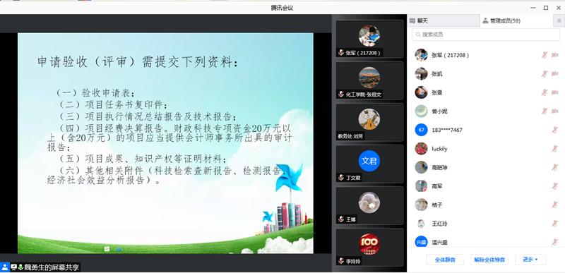 晚上20点,讲座通过腾讯会议开始。魏勇生从天水市科技计划支持重点、市级科技计划管理改革实施进度、市级项目申报管理流程、申请验收需提交材料、项目申报中需要注意的问题等方面展开。讲座内容丰富详实,针对我校教师申报项目时遇到的课题名称设置不准确、对国家有关方针政策了解不够、研究方法不够新颖、研究需求和矛盾把握不准、不能做到学科之间的融会贯通等诸多疑问进行了具体解读。