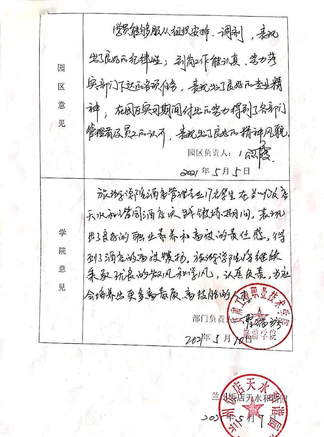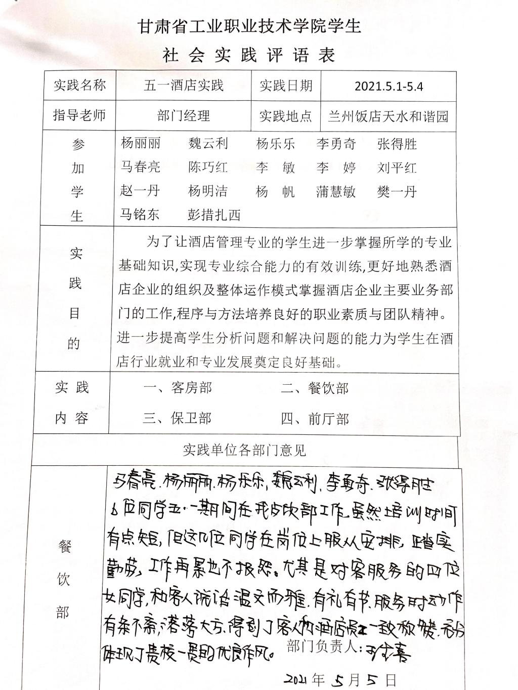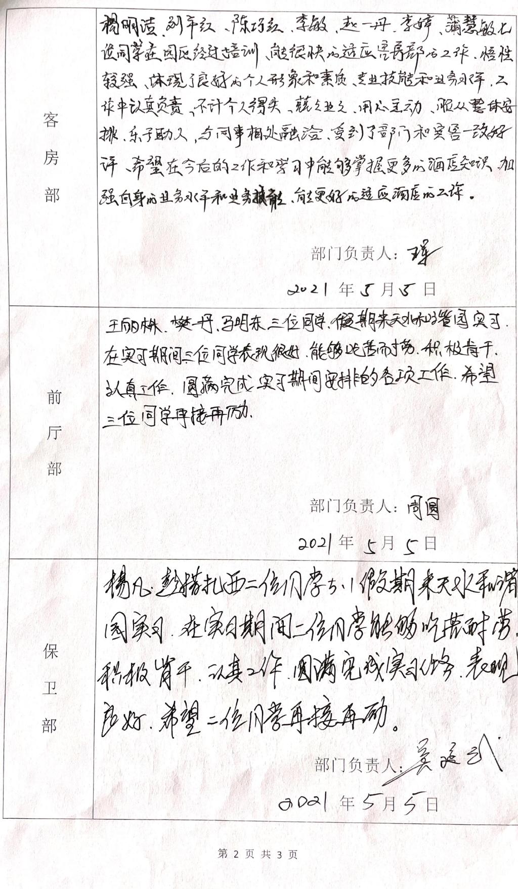 见习期间,同学们充分展现出端正的职业态度、扎实的理论知识及实践技能,表现出积极工作、吃苦耐劳、用心主动、乐于助人的良好精神,得到了各个部门管理者及员工的认可,受到了宾客的一致好评。
