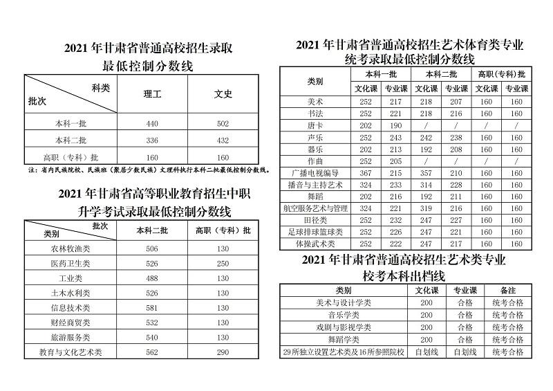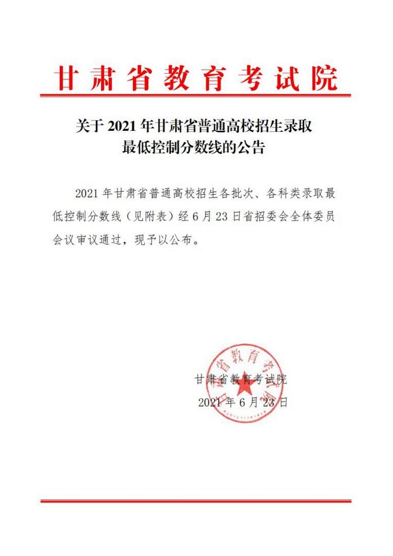 关于2021年甘肃省普通高校招生录取最低控制分数线的公告