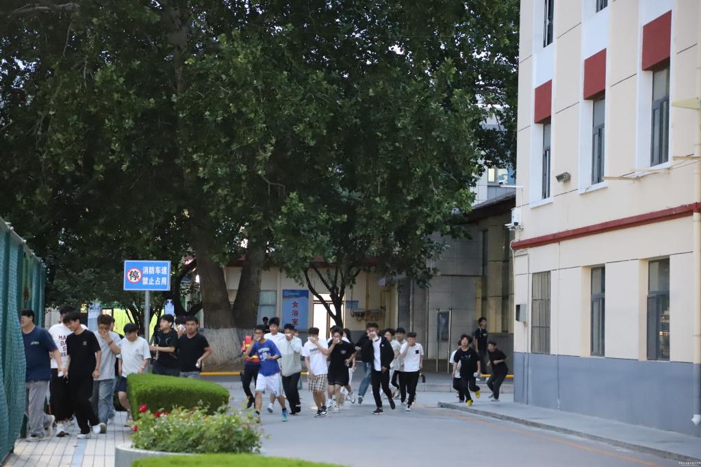当晚8时,随着火灾警报声响起,演练正式拉开帷幕。公寓内瞬间进入紧张有序的疏散状态。学生们迅速反应,用湿毛巾捂住口鼻,弯腰低姿沿预定路线快速撤离。各楼层负责教师坚守岗位,沉着指挥;安保人员迅速就位,模拟开展灭火救援。整个疏散过程忙而不乱,仅用3分钟,全体师生就安全集结至操场指定区域。各班辅导员立即清点人数,确保不落一人。